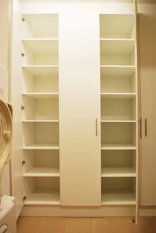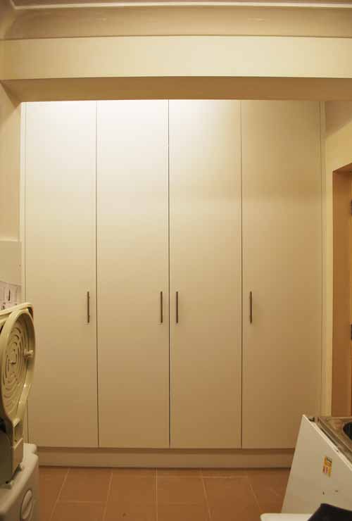 The customer desired the wardrobe to frame the garden window view. Just to make it interesting there was only 400mm either side of the window. So to achieve a reasonable hanging space the units on both sides had to be tapered from 600mm down to 400 mm.